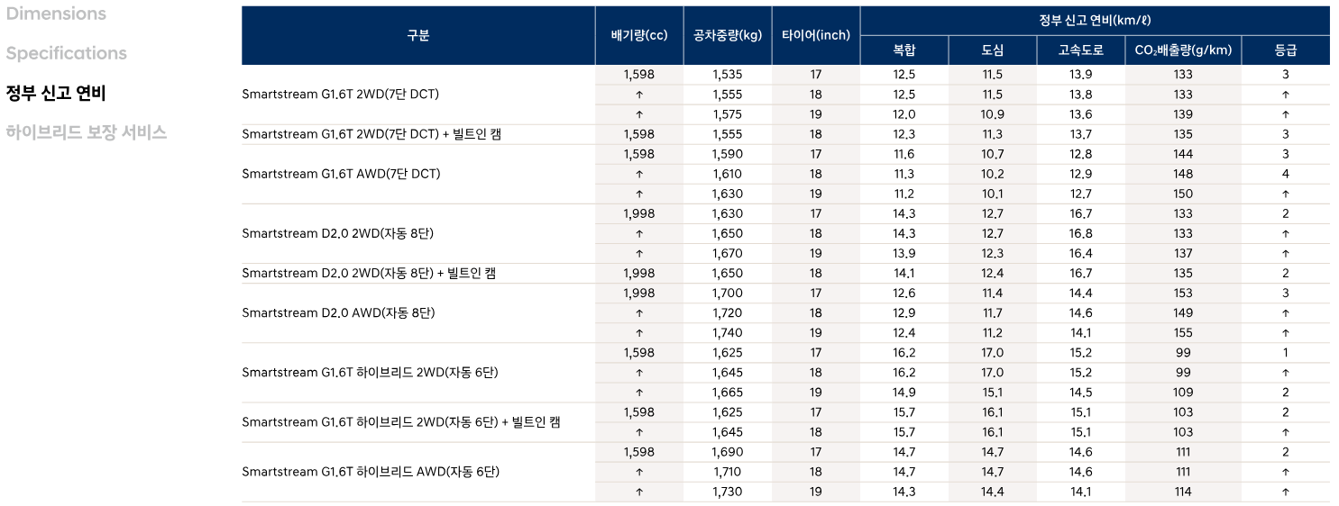 연비는 차량 구매 시 가장 중요한 요소 중 하나입니다. 투싼은 다양한 연료 옵션과 효율적인 주행 성능으로 경제성을 제공합니다.