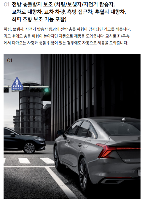 - 전방 충돌방지 보조 (FCA): 전방의 차량, 보행자, 자전거 탑승자 등과의 충돌 위험을 감지하고 경고하거나 제동을 보조하는 기능