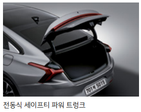 - 7에어백 시스템: 운전석, 동승석, 사이드, 커튼, 운전석 무릎 에어백을 포함한 총 7개의 에어백 시스템