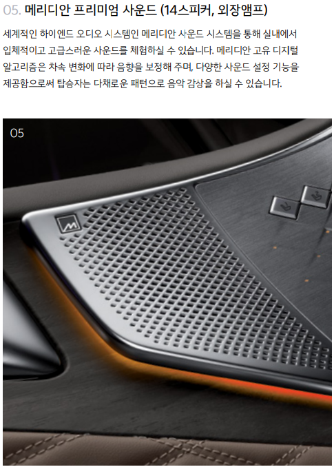- 프리미엄 사운드 시스템: 메리디안 프리미엄 사운드 시스템을 통해 고품질의 음악을 즐길 수 있음