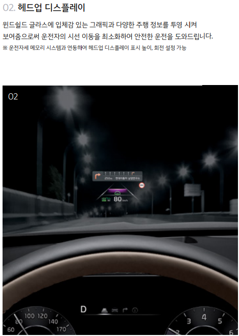 - 헤드업 디스플레이 (HUD): 운전자의 시선 이동을 최소화하여 안전 운전을 돕는 기능