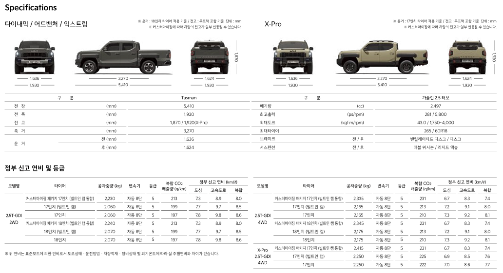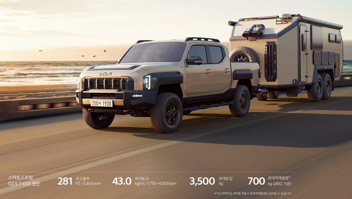 기아 타스만 | 37,500,000원~ | 281마력 | 43kg·m | 3,500kg |