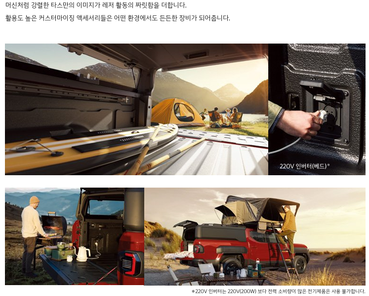 - 루프랙, 오프로드 타이어 등 아웃도어에 적합한 구성