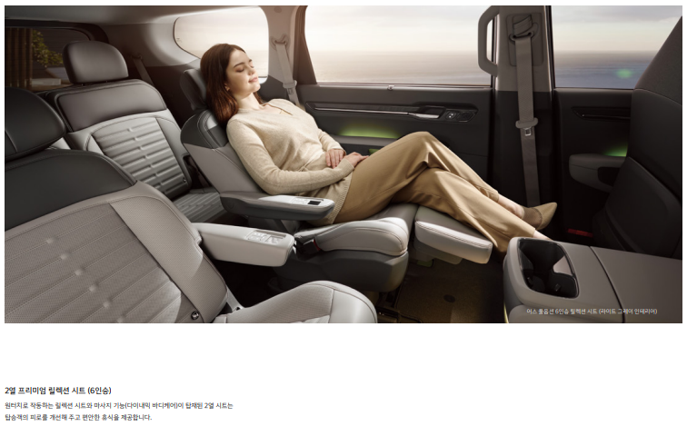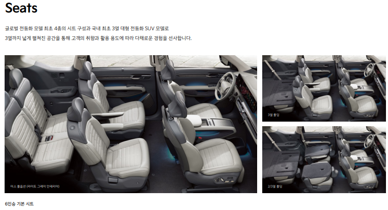 EV9은 넓고 여유로운 실내 공간을 자랑합니다. 3열까지 넉넉하게 앉을 수 있는 7인승 또는 6인승 모델 중 선택 가능하며, 2열에는 독립 시트를 적용하여 마치 비행기 일등석과 같은 편안함을 제공합니다.