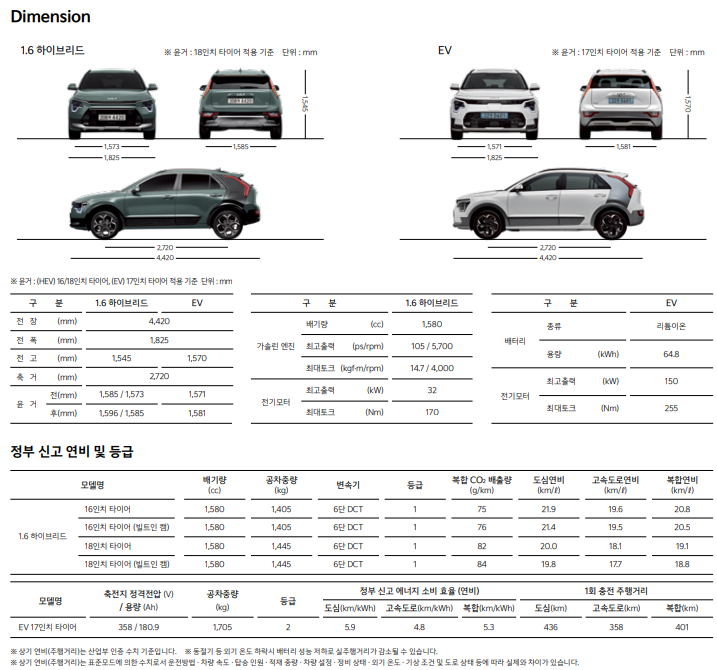 니로 EV는 전기차로서 뛰어난 성능과 효율성을 자랑합니다. 아래는 주요 제원을 정리한 표입니다.