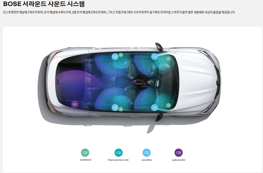 전방 충돌방지 보조, 차선 유지 보조, 사각지대 경고 시스템, 후방 교차 충돌 방지 보조