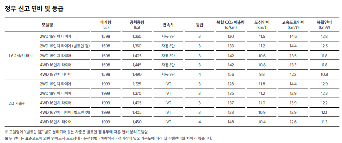 • 가솔린 1.6 터보: 복합 연비 12.7km/L (도심 11.5km/L, 고속도로 14.5km/L)