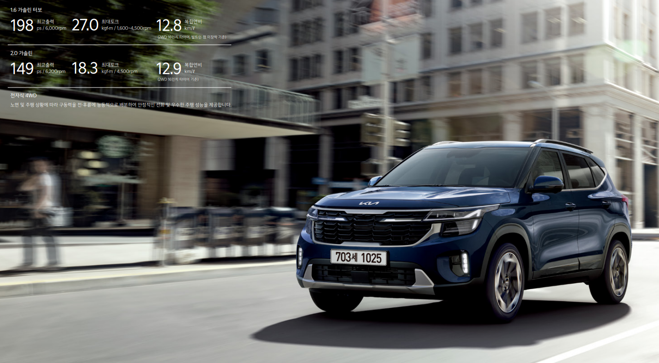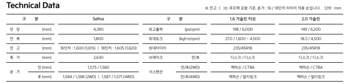 • 셀토스 배기량: 1,598cc (1.6 터보) / 1,999cc (2.0 가솔린)