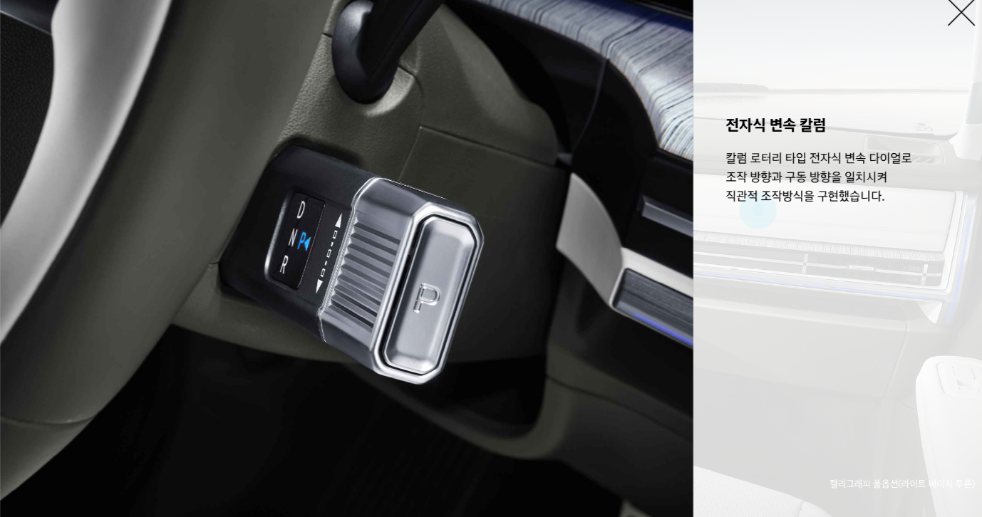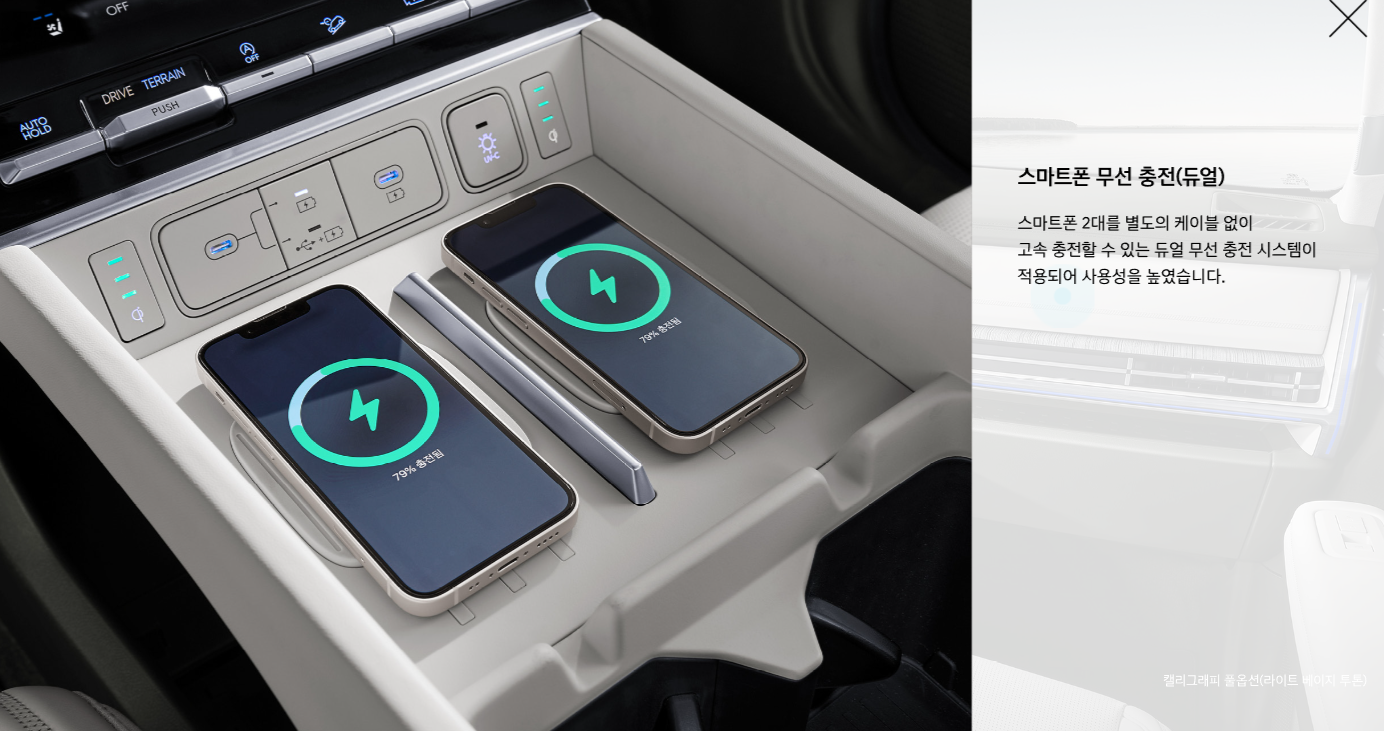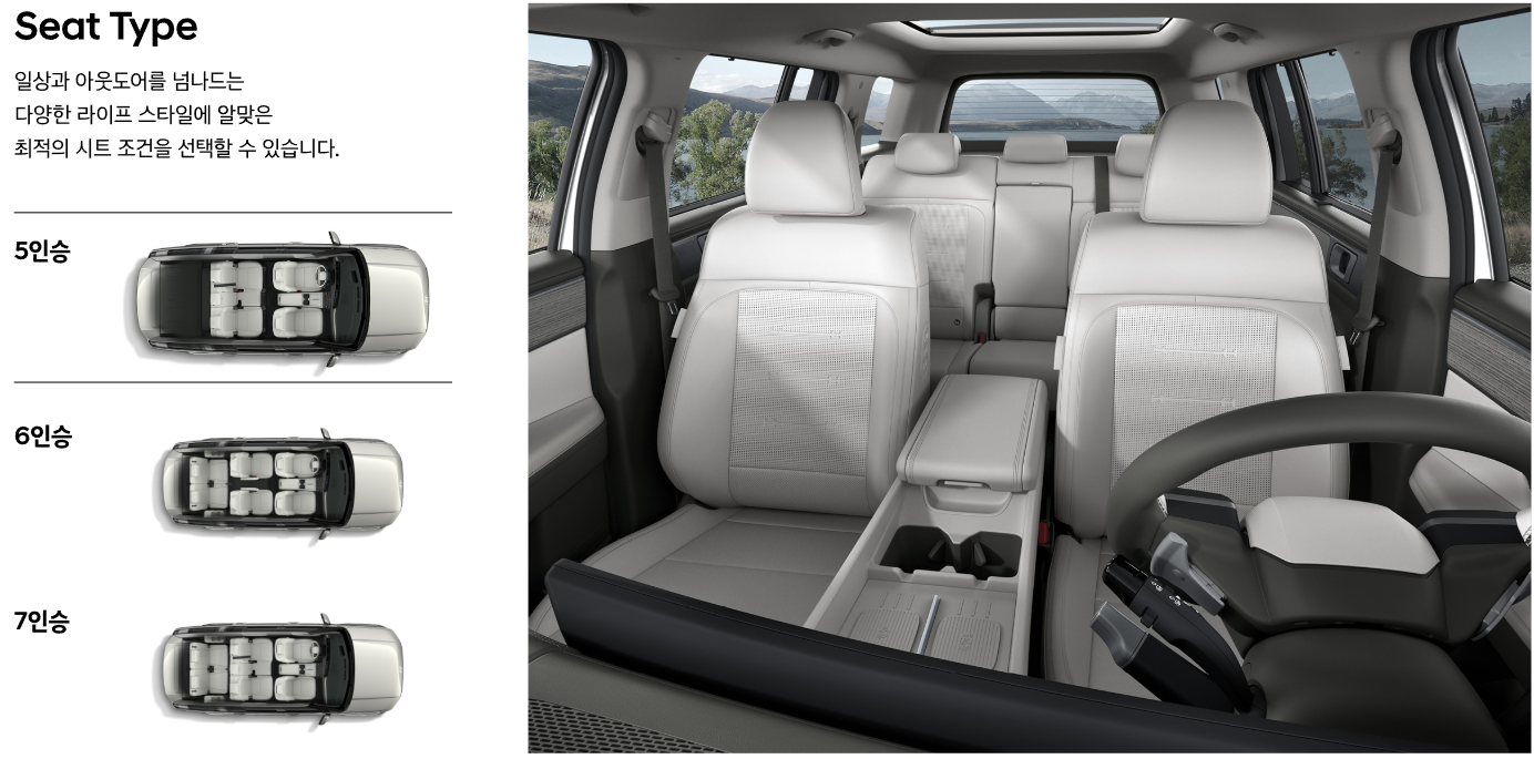 • 인테리어: 파노라마 선루프, 앰비언트 무드램프, 나파 가죽 시트, 2열 스마트폰 무선 충전 시스템