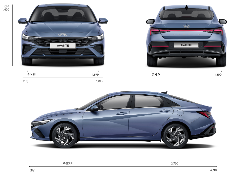 • 2025 아반떼 전장 X 전폭 X 전고: 4,675 X 1,825 X 1,430mm