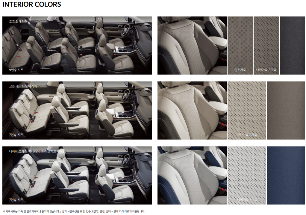 - 대가족: 7~9인승 구성으로 넉넉한 실내 공간 제공