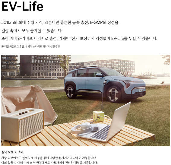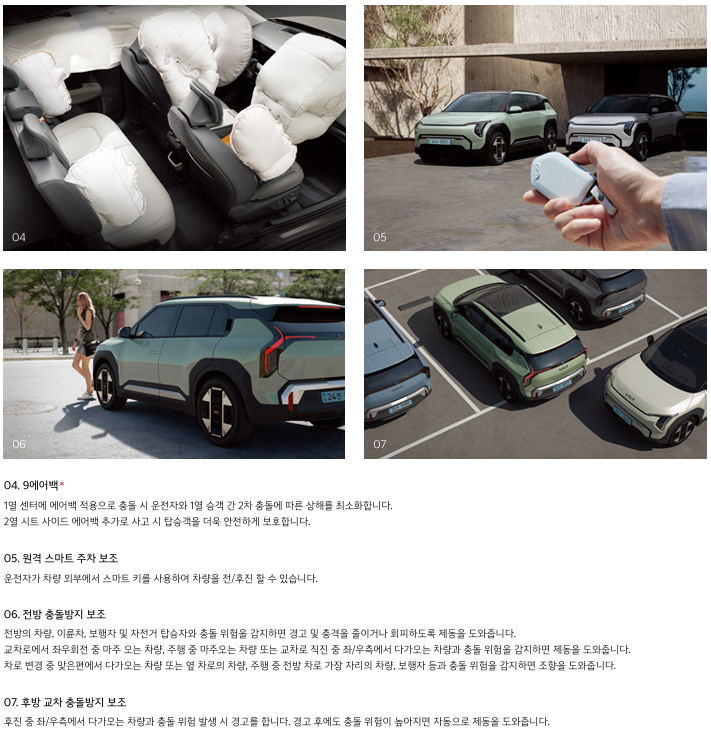 - 2025 EV3 넉넉한 주행 거리: 롱레인지 모델 기준 약 550km로, 장거리 운전에도 적합합니다.
