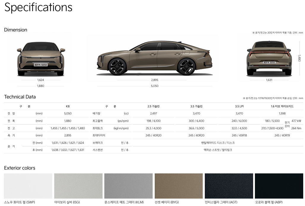 K8 페이스리프트 1.6 터보 하이브리드 180ps(엔진) + 44.2kW(모터) 27.0kg.m(엔진) + 265Nm(모터) 17.1km/ℓ