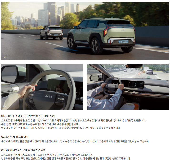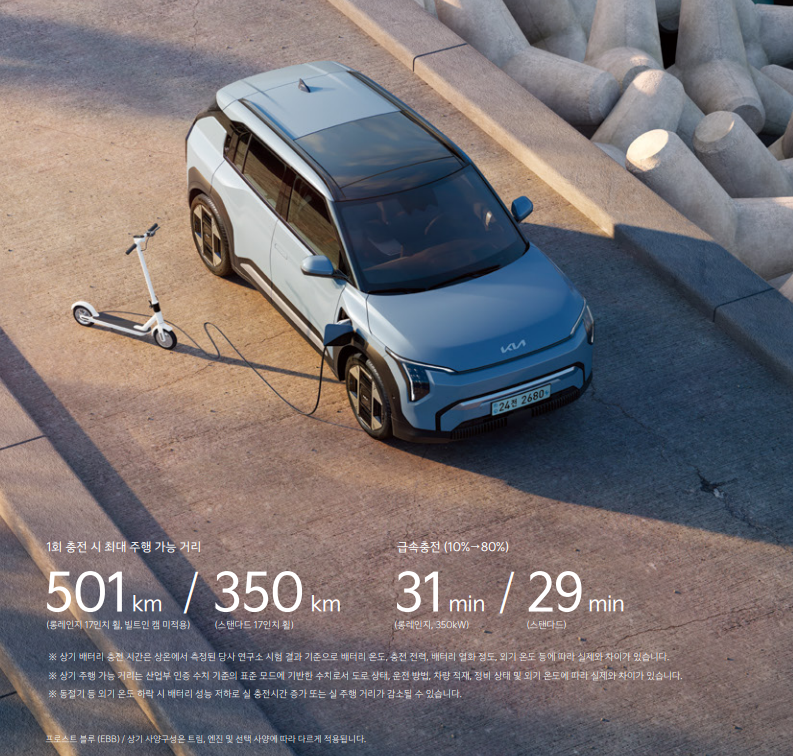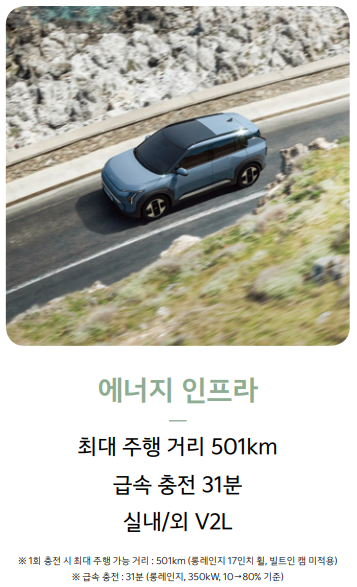 - EV3 롱레인지 모델: 77.4kWh 배터리, 1회 충전 시 약 500km 주행 가능