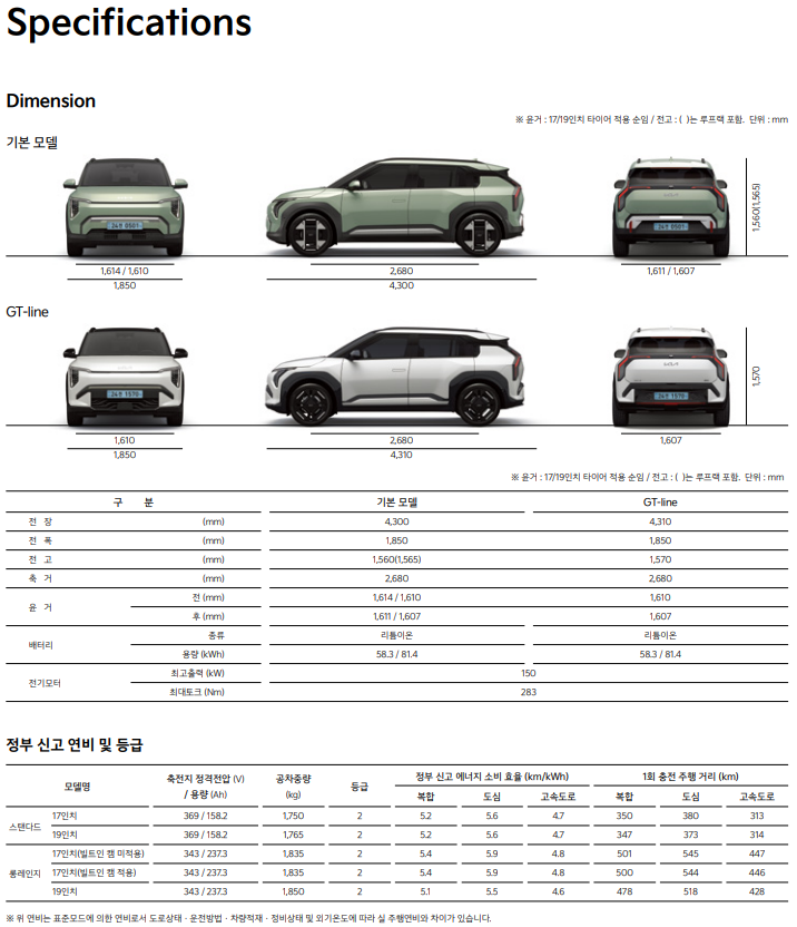 - EV3 롱레인지 모델: 77.4kWh 배터리, 1회 충전 시 약 500km 주행 가능