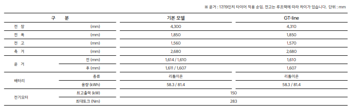 | 트림 | 배터리 | 가격 (보조금 적용 전) | 주요 기본 사양 |