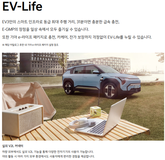 👨💻 테크 인사이트: "EV3의 V2L 기능은 캠핑이나 비상 시 매우 유용합니다. 최대 3.6kW의 전력을 외부로 공급할 수 있어, 노트북은 물론 소형 전기 제품도 사용 가능합니다." - 이기술, IT 전문가