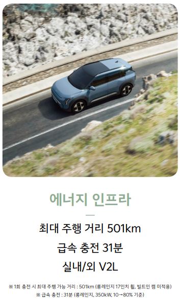 | EV3 에어 롱레인지 | 77.4kWh | 4,365만원 | 에어 스탠다드 사양 + 더 긴 주행거리 |