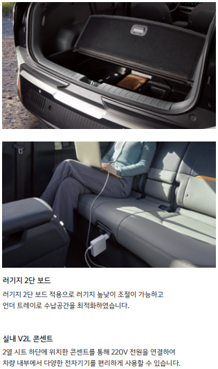 - V2L (Vehicle to Load): 차량의 배터리를 외부 전원으로 사용 가능