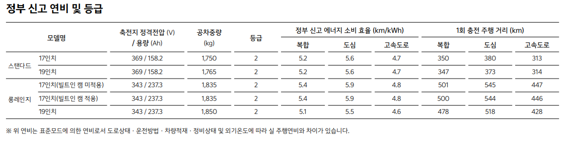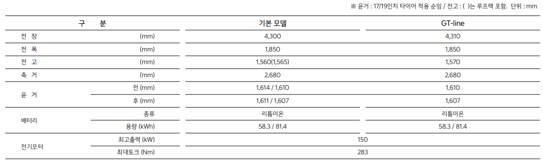 - 배터리 용량: 58.3kWh (스탠다드) / 81.4kWh (롱레인지)
