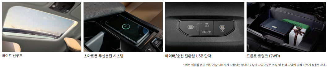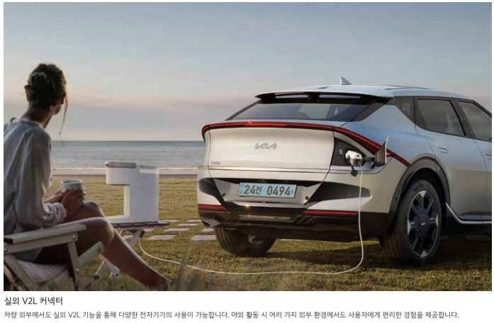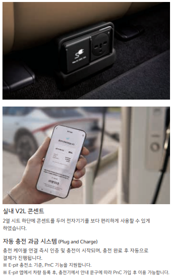 - V2L 기능: 차량 외부 전자기기 사용 가능 (최대 3.6kW)