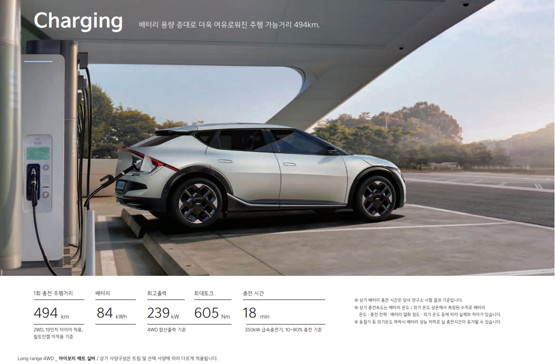 - 충전 시간: 350kW 초급속 충전기 기준 18분에 10%에서 80%까지 충전 가능