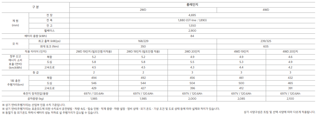 - 1회 충전 주행거리: 최대 528km (롱레인지 2WD 19인치 휠 기준)