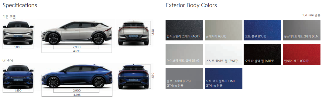 EV6의 긴 축거는 넓은 실내 공간을 제공하며, 낮은 전고는 공기역학적 효율성을 높여줍니다. 특히 GT 모델의 경우, 스포츠카 못지않은 강력한 성능을 자랑합니다.