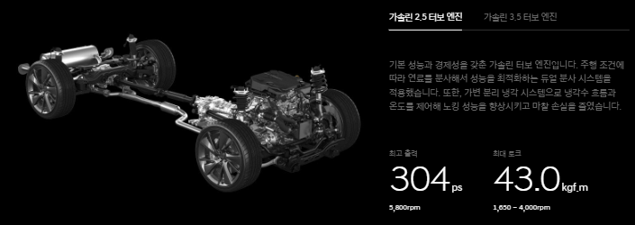 | 최고 출력 | 304마력 (2.5 터보), 380마력 (3.5 터보) |