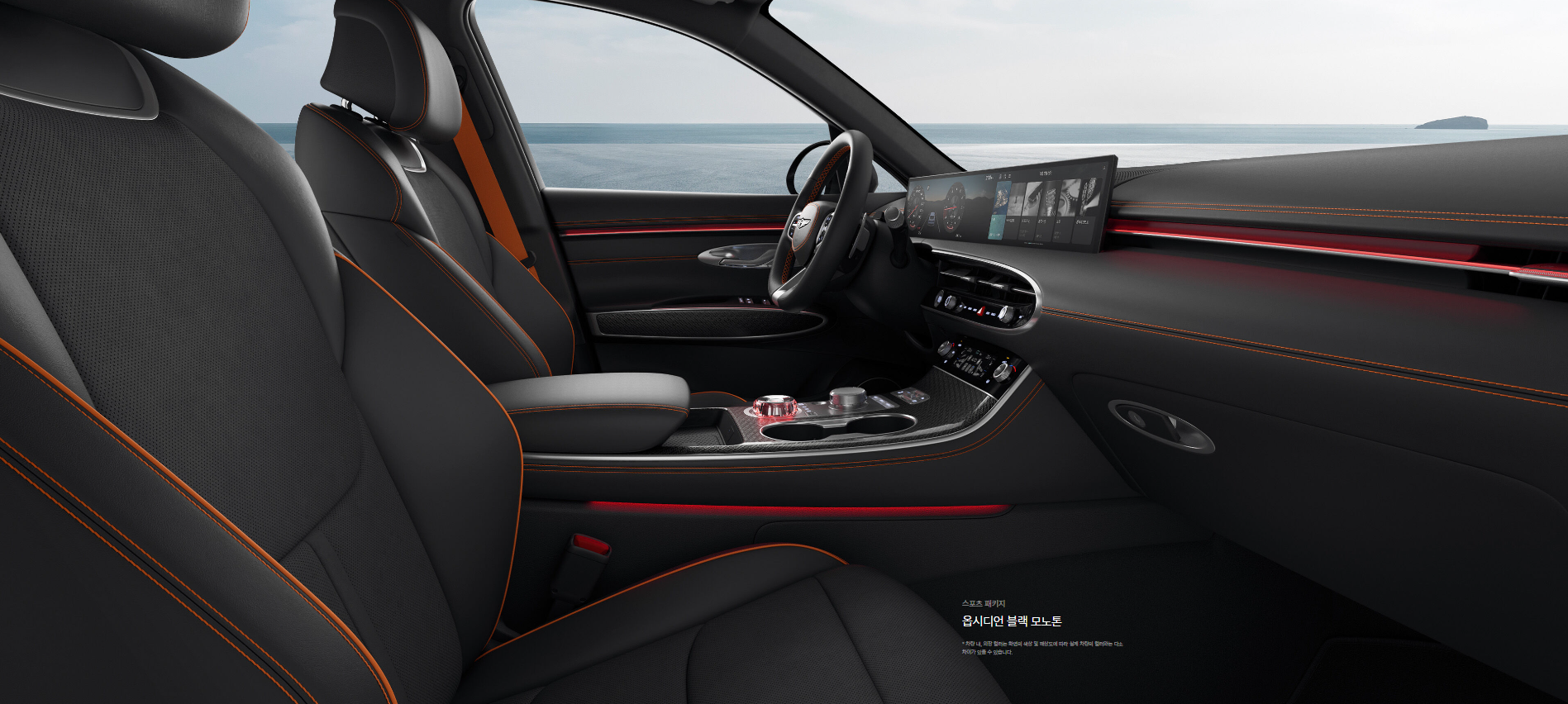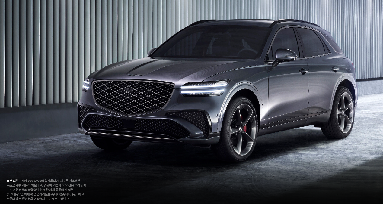 GV70의 내부는 고급 가죽 시트와 최신 인포테인먼트 시스템으로 구성되어 있으며, 스포츠 패키지는 스포츠 핸들링과 외관 디자인을 추가로 제공합니다.